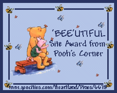 The Signature Award is for those sites that not only show a GREAT love of that lovable bear, but have also put great effort into making their sites reflect some of the things that Pooh represents. They have put effort into coming up with some ideas on their own (i.e. design features, animation, ways they have used graphics ect.). Their sites are an inspiration to those who visit & give ideas to others who are in the process of developing their own sites. You have truly put your time, heart, & soul into your site, & it shows! |