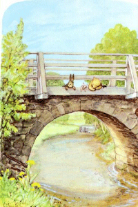 Now one day Pooh and Piglet and Rabbit and Roo were all playing Poohsticks together. They dropped their sticks in when Rabbit said "Go!" and then they had hurried across to the other side of the bridge, and now they were all leaning over the edge, waiting to see whose stick would come out first. But it was a long time coming, because the river was very lazy that day, and hardly seemed to mind if it didn't ever get there at all. "I can see mine!" cried Roo. "No, I can't, it's something else. Can you see yours, Piglet? I thought I could see mine, but I couldn't. There it is! No, it isn't. Can you see yours, Pooh?" "No," siad Pooh. "I expect my stick's stuck," said Roo. "Rabbit, my stick's stuck. Is your stick stuck, Piglet?" "They always take longer than you think," said Rabbit. "How long do you think they'll take?" asked Roo. "I can see yours, Piglet," said Pooh suddenly. "Mine's sort of greyish one," said Piglet, not daring to lean too far over in case he fell in. "Yes, that's what I can see. It's coming over on to my side." Rabbit leant over further than ever, looking for his, and Roo wriggled up and down, calling out "Come on, stick! Stick, stick, stick!" and Piglet got very excited because his was the only one which had been seen, and that meant that he was winning. "It's coming!" said Pooh. "Are you sure it's mine?" squeaked Piglet excitedly. "Yes, because it's grey. A big grey one. Here it comes! A very---big---grey---Oh, no, it isn't, it's Eeyore." And out floated Eeyore. "Eeyore!" cried everybody. Looking very calm, very dignified, with his legs in the air, came Eeyore from beneath the bridge. |